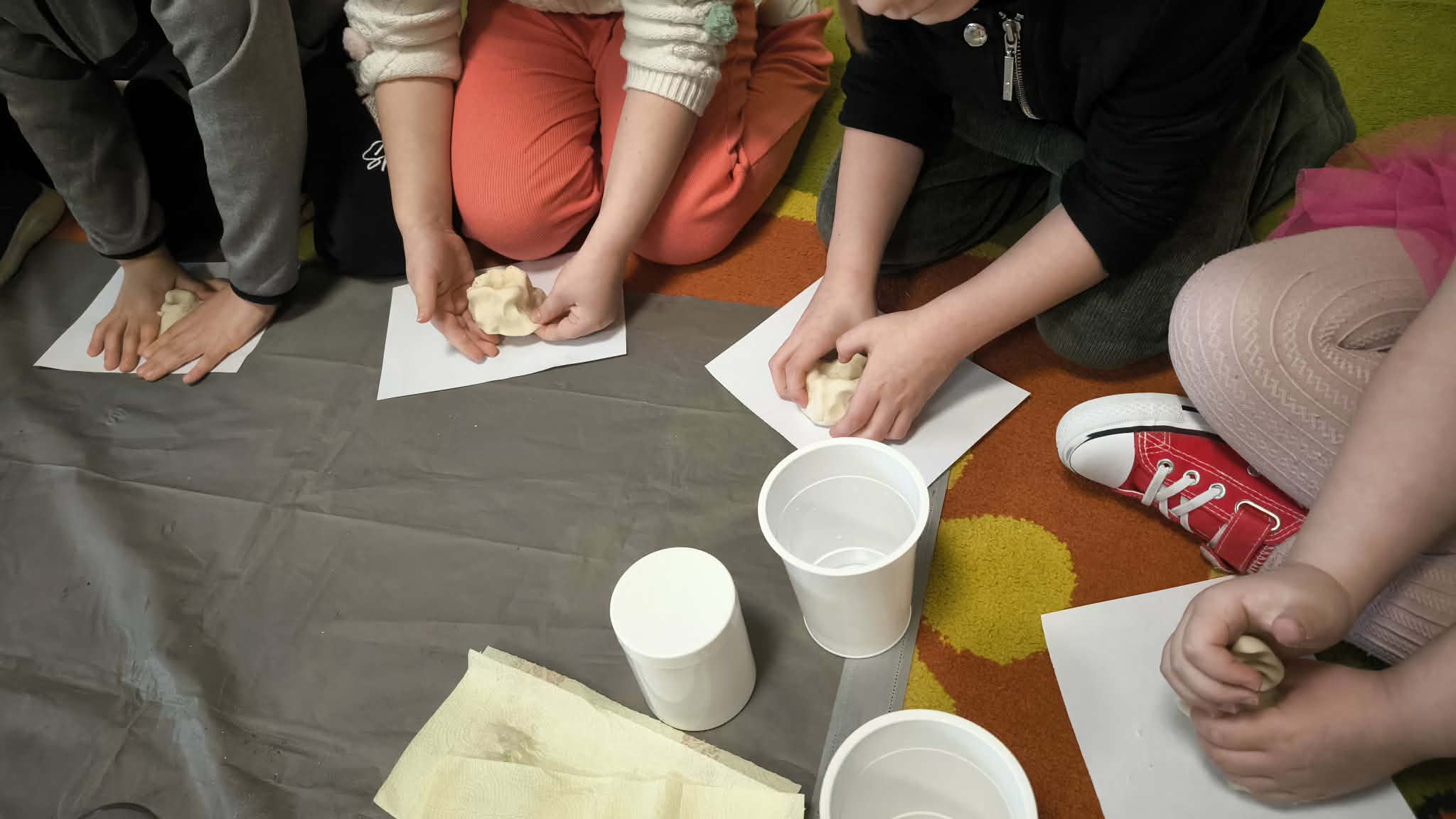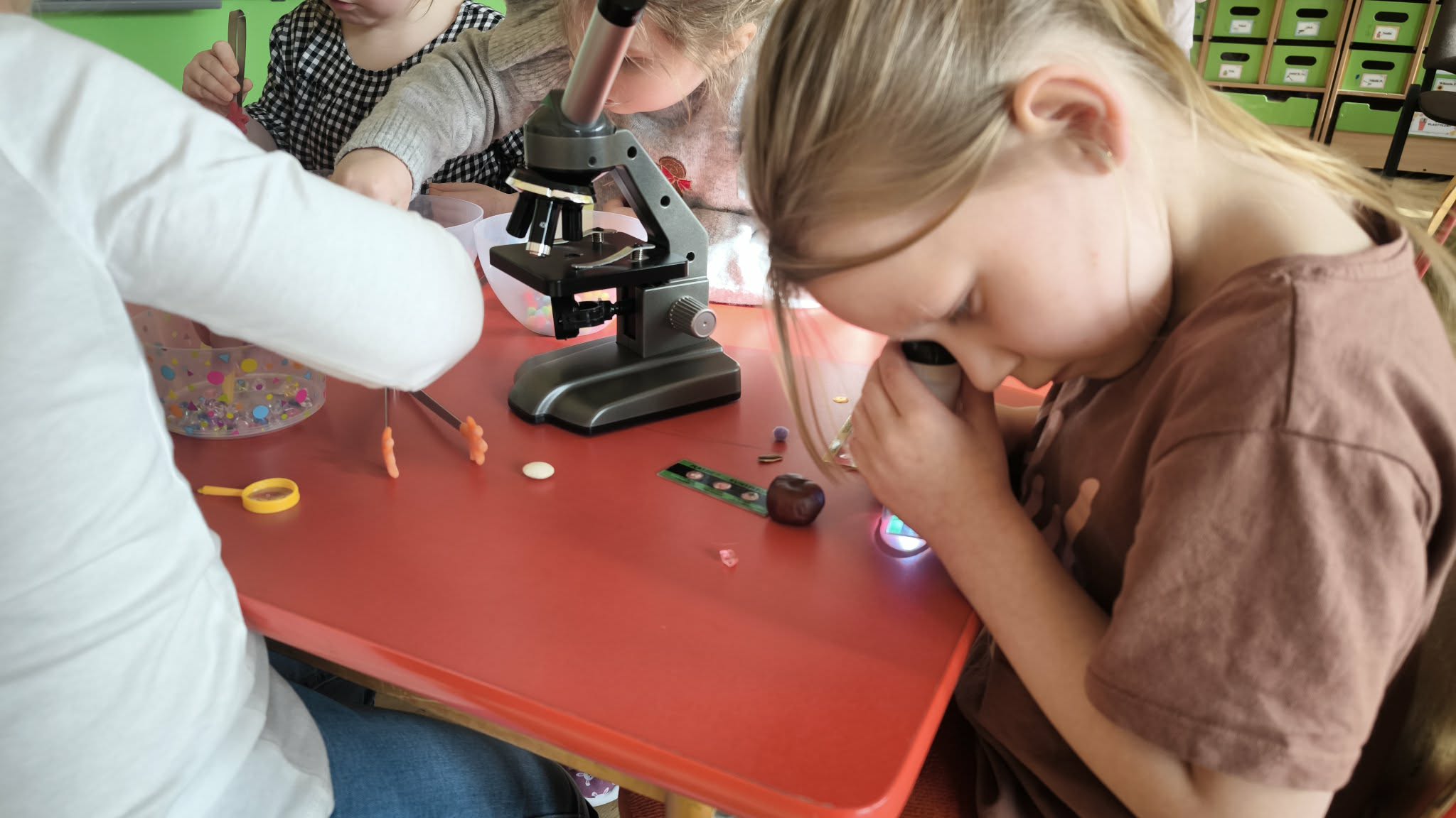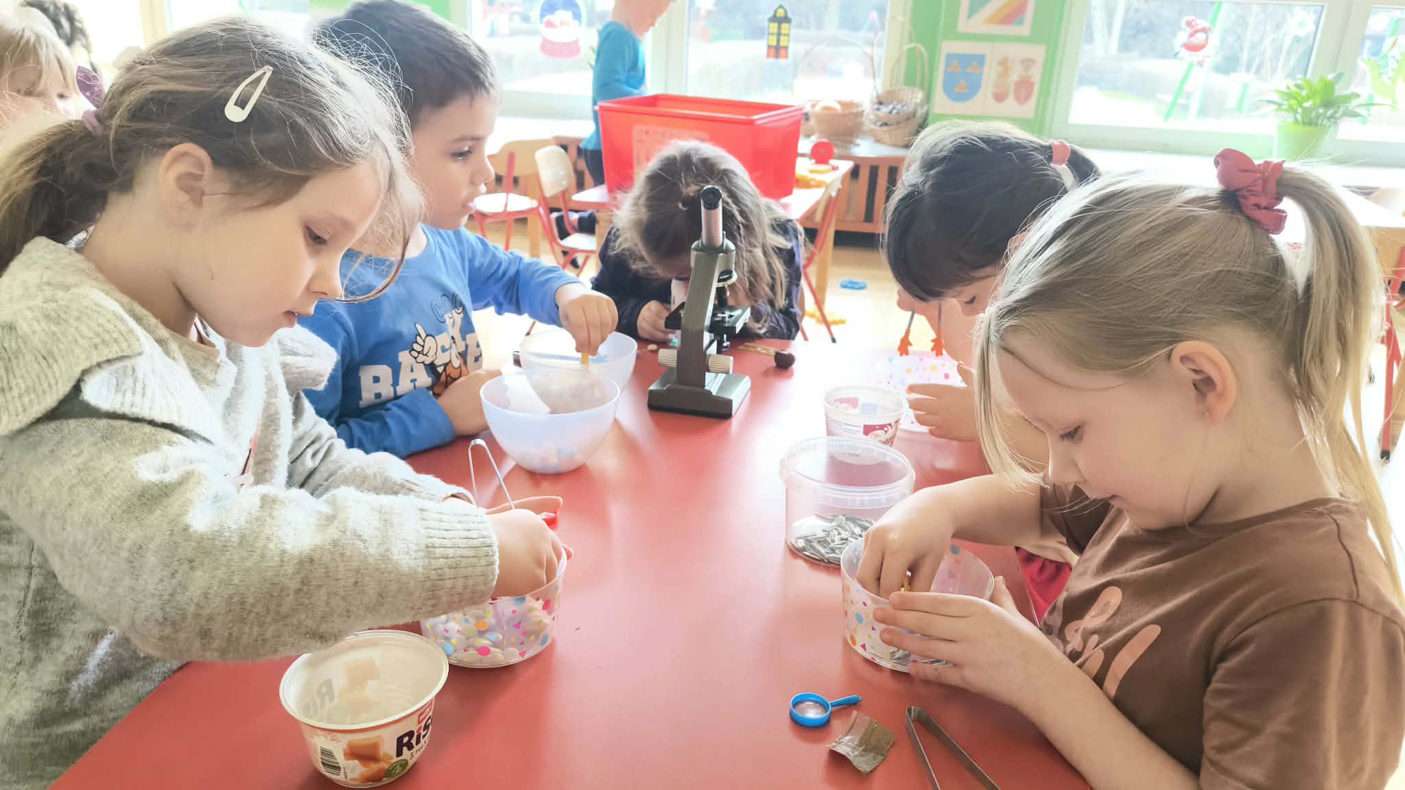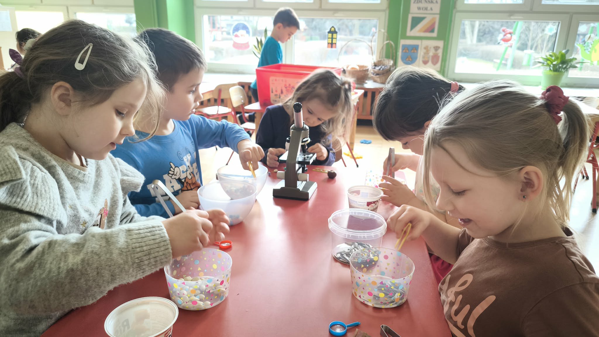W lutym dzieci z grupy III zamieniły się w małych chemików i naukowców. Miały okazję sprawdzić jak wyglądają różne przedmioty pod mikroskopem, np. kawałek siatki plastikowej, różne ziarnka czy krople kawy i herbaty. W dodatku ćwiczyły motorykę małą poprzez przekładanie drobnych przedmiotów za pomocą różnych pęset. Sprawdzały także co się stanie gdy do mleka dodamy różne barwniki a na koniec zamoczymy patyczek w płynie do mycia naczyń. "Magiczne mleko" tworzy tęczę, a także uczy o działaniu detergentów i jak radzą sobie z brudem. Na koniec przy pomocy Nauczyciela wykonały masę solną, a z nich wspaniałe małe wulkany.