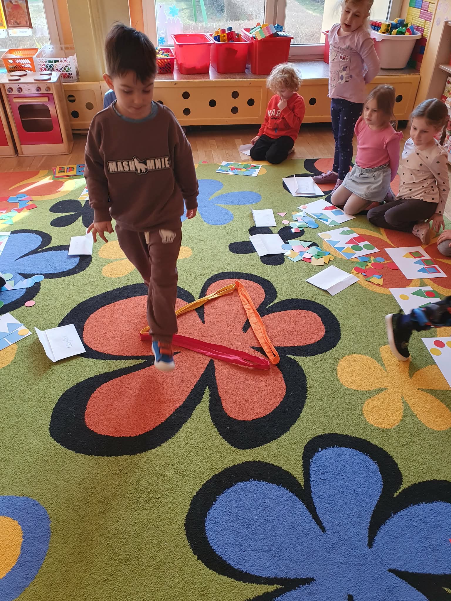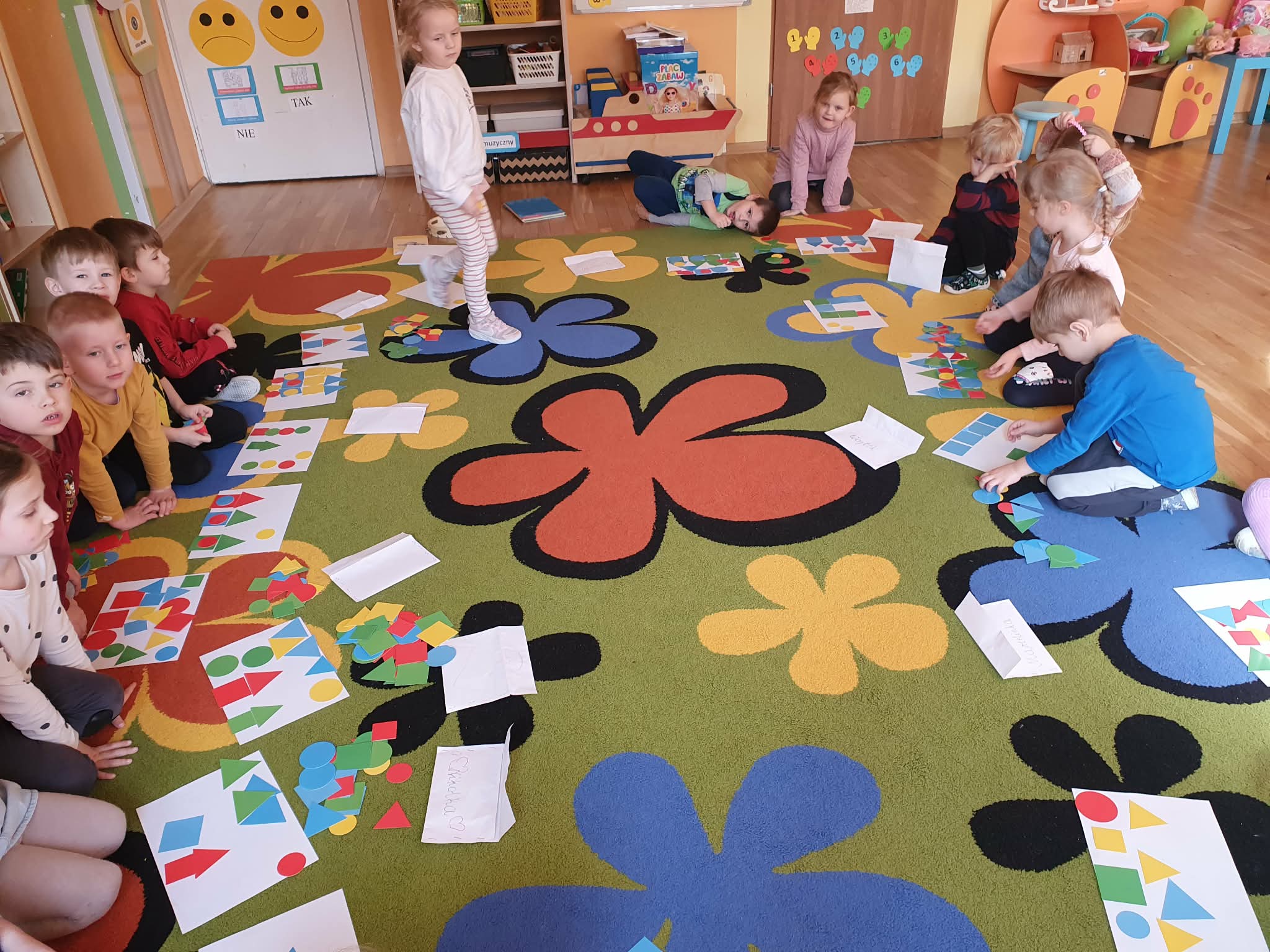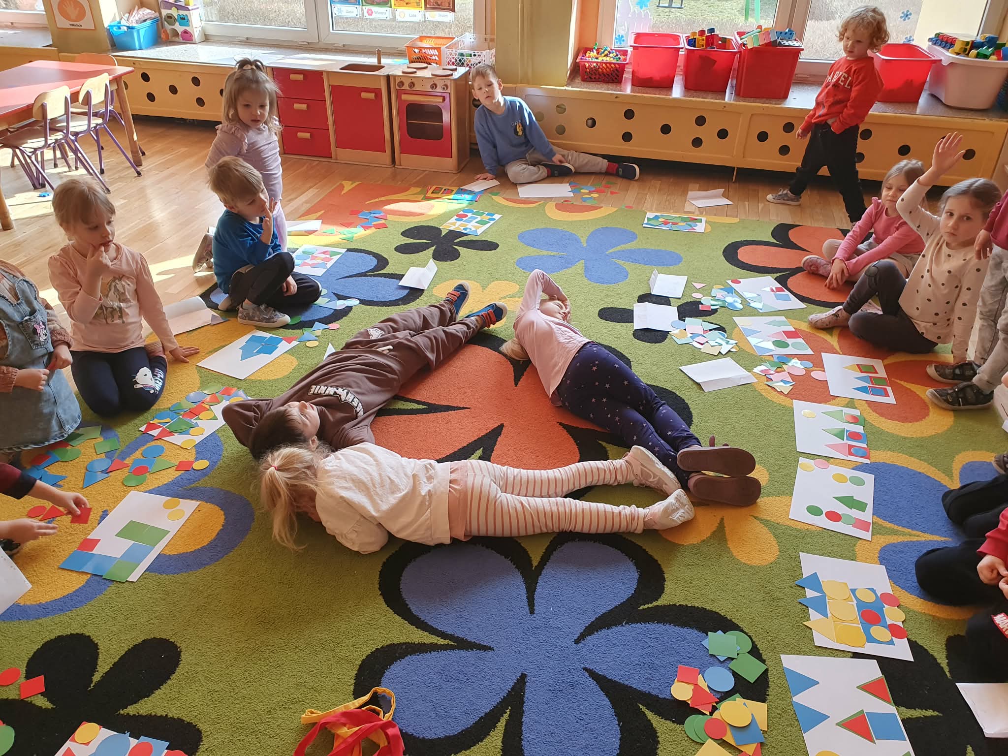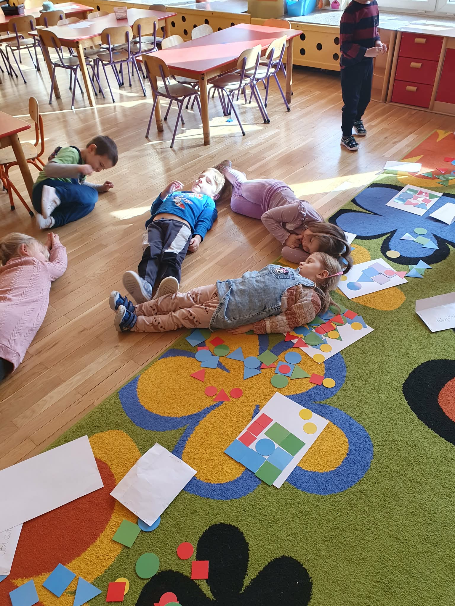 W naszej grupie dzieci kontynuują odkrywanie fascynującego świata matematyki poprzez zabawy z figurami geometrycznymi. Tym razem skupiliśmy się na trójkącie. Podczas zajęć przedszkolaki układały własne kompozycje z kolorowych trójkątów, przeliczały je, segregowały według wielkości i kolorów, a następnie tworzyły kształty figur przy użyciu szarf. Najwięcej radości sprawiło dzieciom układanie trójkątów ze swoich ciał, co rozwijało nie tylko wyobraźnię przestrzenną, ale także współpracę i koordynację ruchową. Zajęcia były nie tylko okazją do nauki matematyki w praktyce, ale także do kreatywnej zabawy, wzmacniania koncentracji i rozwijania logicznego myślenia. Dzięki takim aktywnościom dzieci poznają podstawowe figury geometryczne w sposób ciekawy i angażujący.