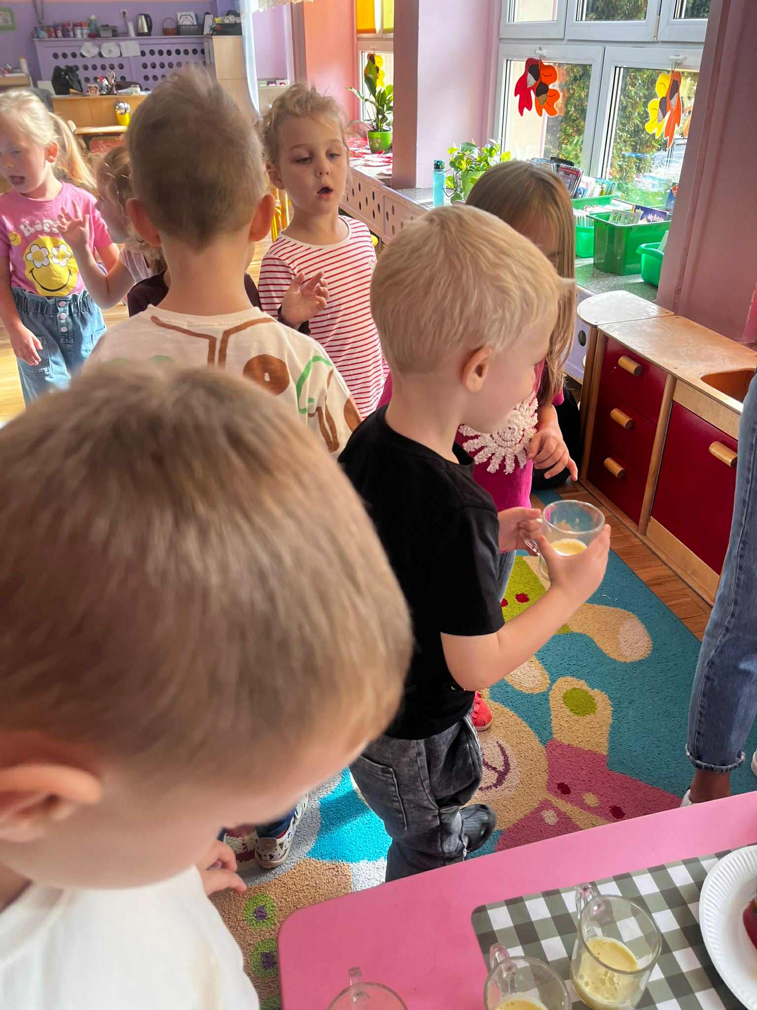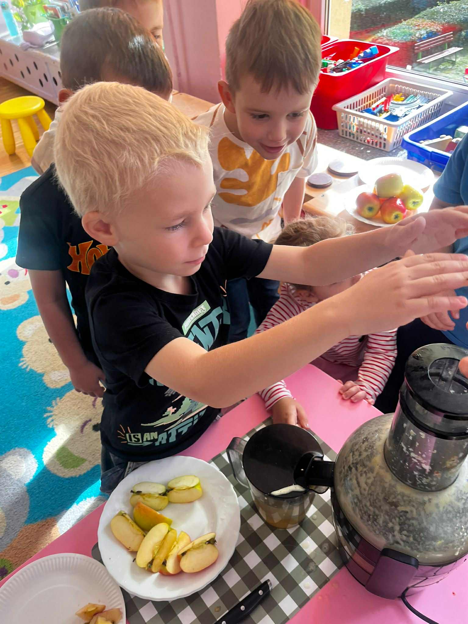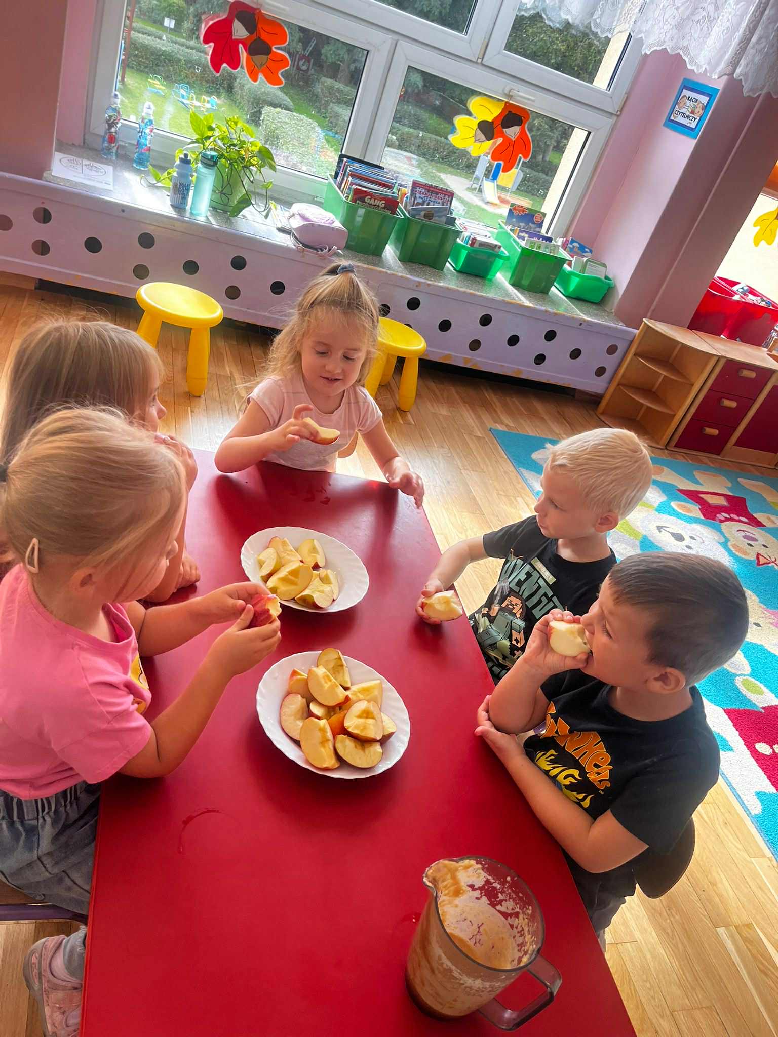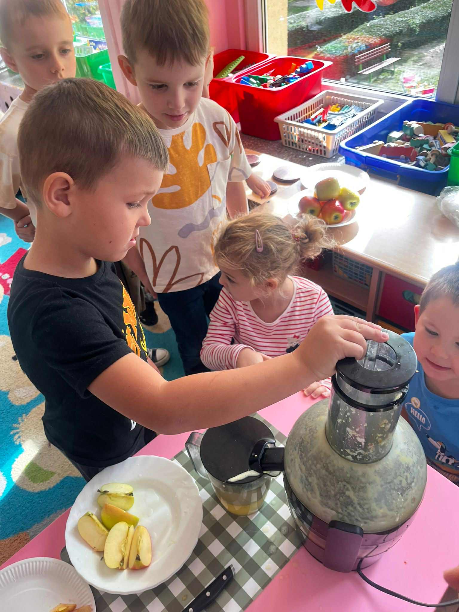29 września święto jabłka. Skrzaty poznały cykl wzrostu jabłka od nasionka do owocu. Wspólnie robiliśmy sok jabłkowy, bawiliśmy się przy muzyce z gumą animacyjną oraz wykonały piękne prace plastyczne.