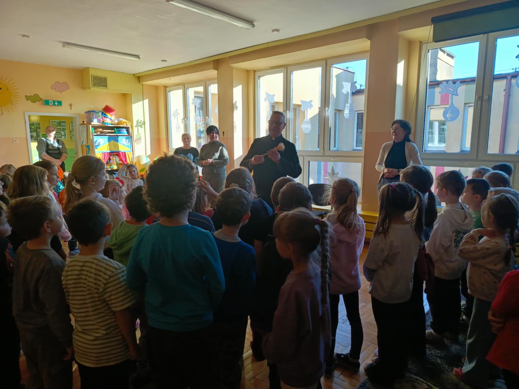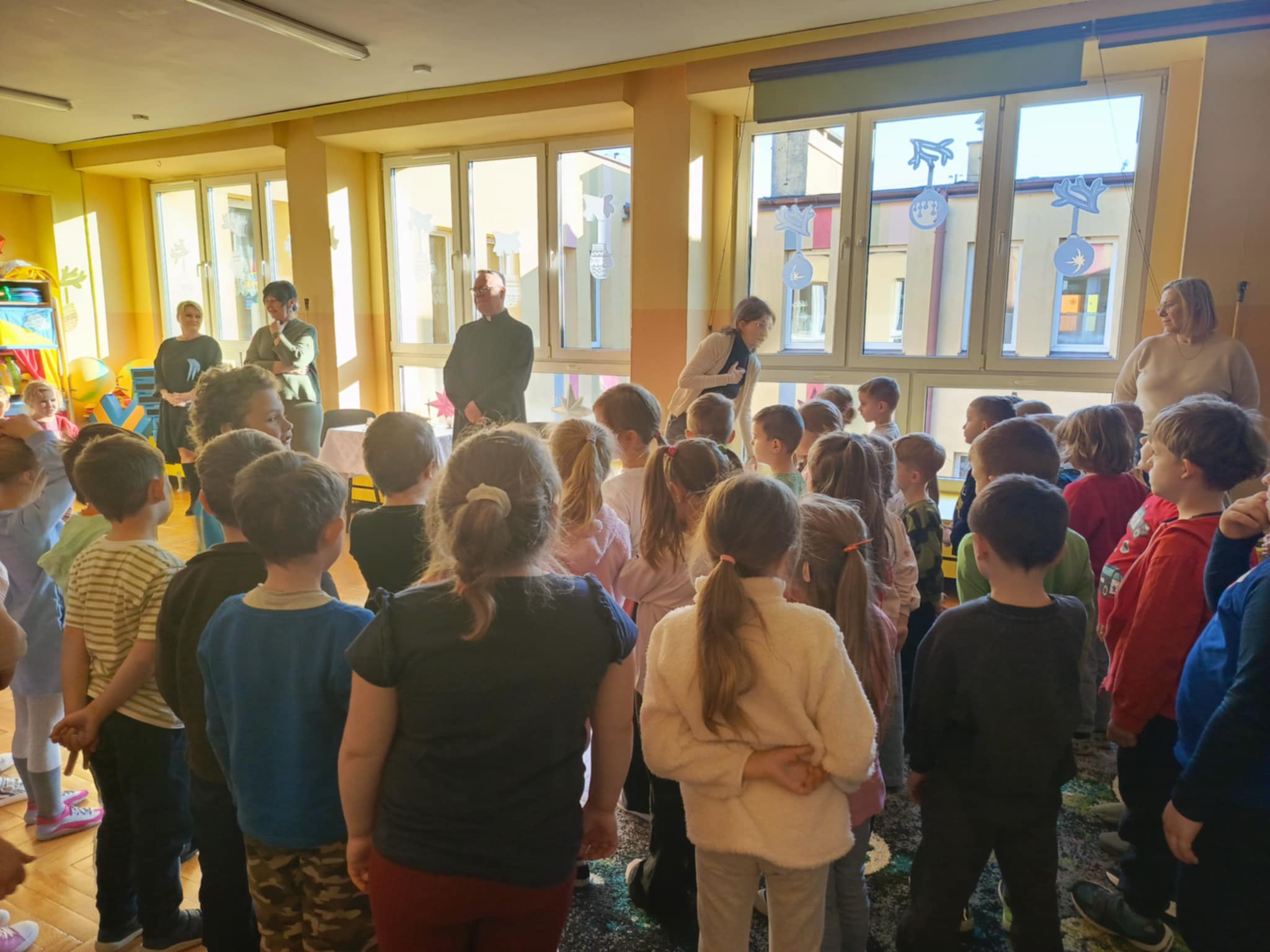W naszym przedszkolu odbyła się wizyta duszpasterska – kolęda. Placówkę odwiedził ksiądz, który poprowadził wspólną modlitwę oraz spotkanie o charakterze religijnym. Dzieci uczestniczyły w wydarzeniu z należytą uwagą i skupieniem, poznając znaczenie tradycji kolędowania. Spotkanie przebiegło w spokojnej i podniosłej atmosferze, sprzyjającej refleksji oraz kultywowaniu wartości i tradycji chrześcijańskich.