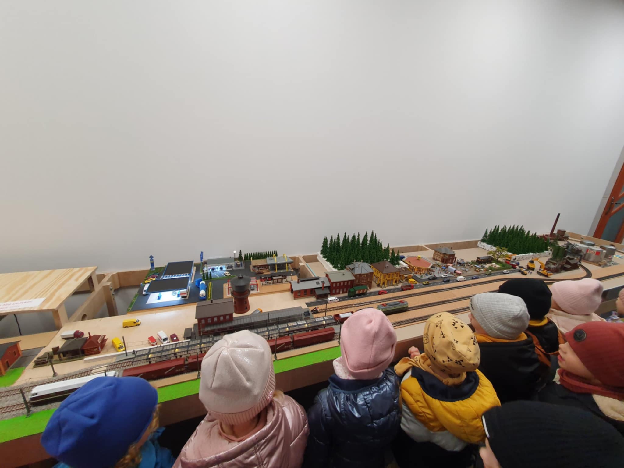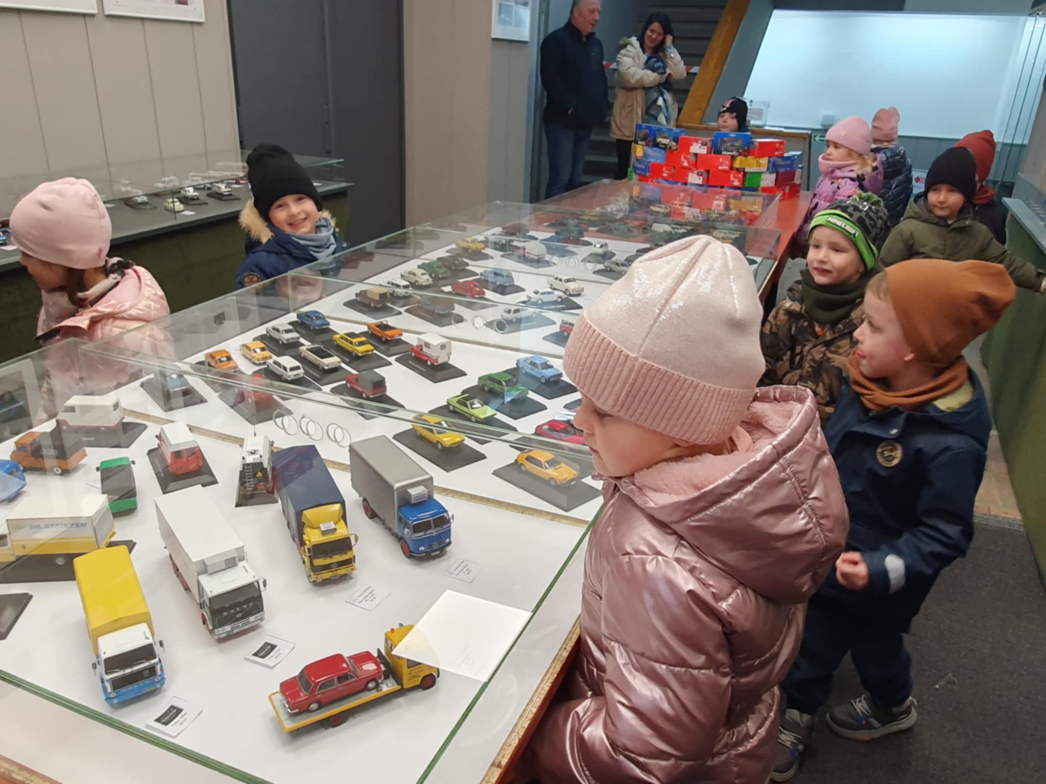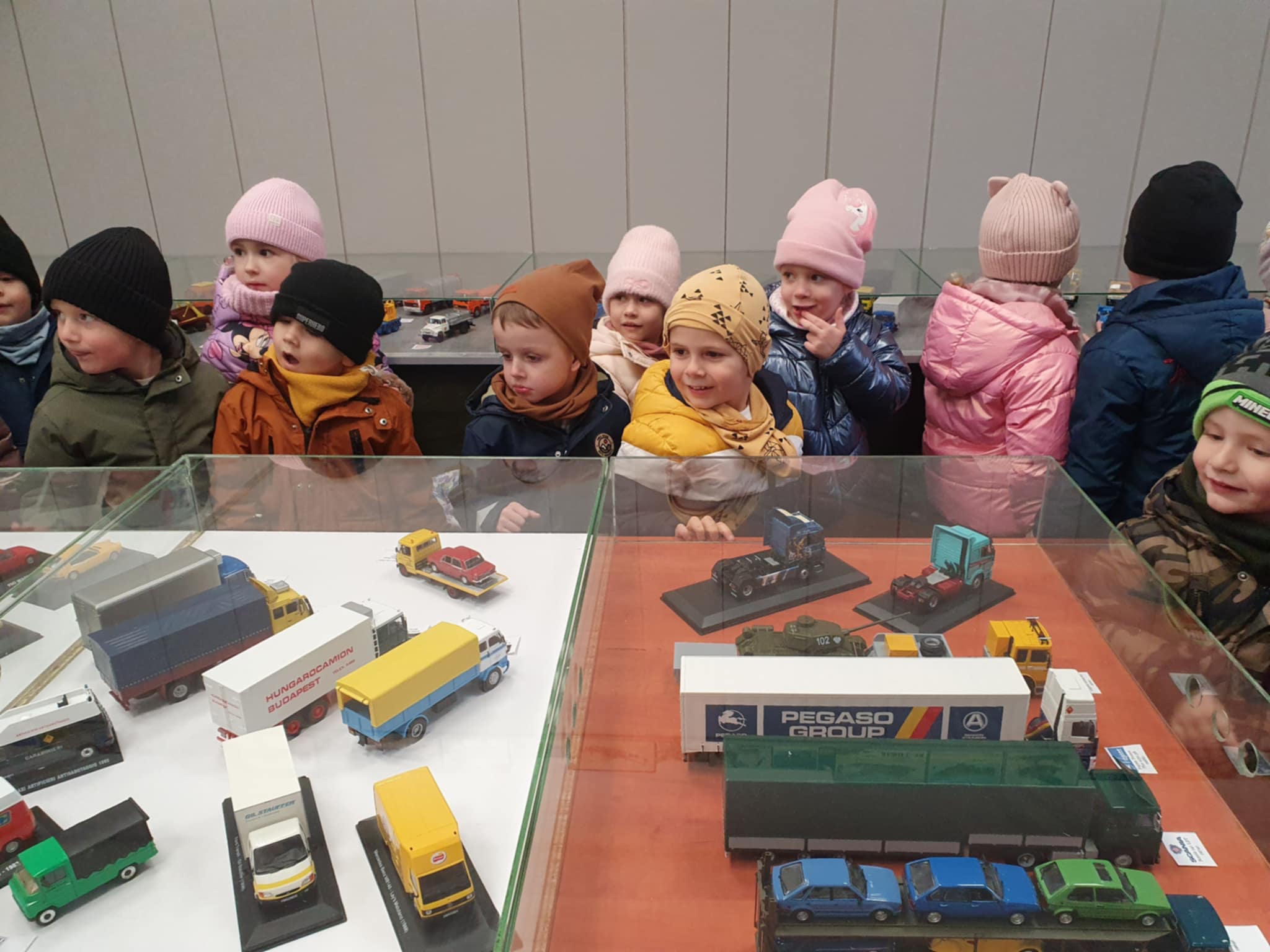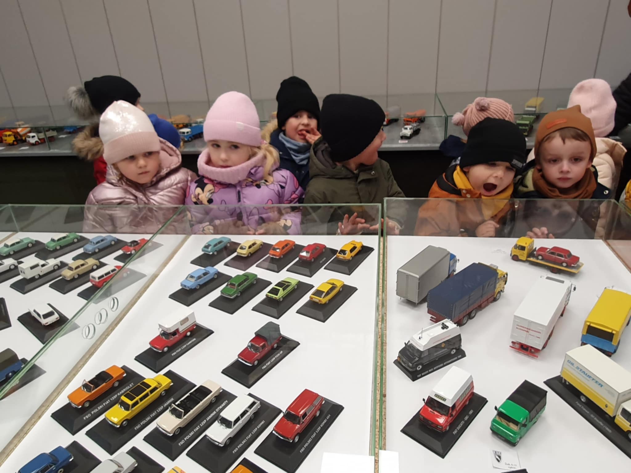 Nasza grupa wybrała się na autorską wystawa modeli pojazdów z minionych epok. Dzieci miały okazję zobaczyć imponującą kolekcję modeli, głównie z okresu PRL-u, ale również z innych lat. Wśród eksponatów znalazł się szeroki wachlarz pojazdów w skali 1:43 – od modeli służb takich jak straż pożarna, policja czy pogotowie ratunkowe, aż po zwykłe pojazdy cywilne: taksówki, ciężarówki, auta osobowe. Dzieci z ciekawością oglądały każdy model, porównywały kolory, kształty, a także poznawały ich zastosowanie w dawnych czasach. Dodatkową atrakcją był również model kolejki i pociągów, które wzbudziły ogromne zainteresowanie dzieci. Z zaciekawieniem obserwowały detale wagonów i lokomotyw, poznając, jak wyglądała dawna kolej. Na wystawę zaprosił nas tata Nikodema, któremu serdecznie dziękujemy za zaangażowanie i możliwość przeniesienia naszych przedszkolaków w fascynującą podróż do przeszłości. To była wyjątkowa lekcja historii połączona z odkrywaniem świata techniki.
