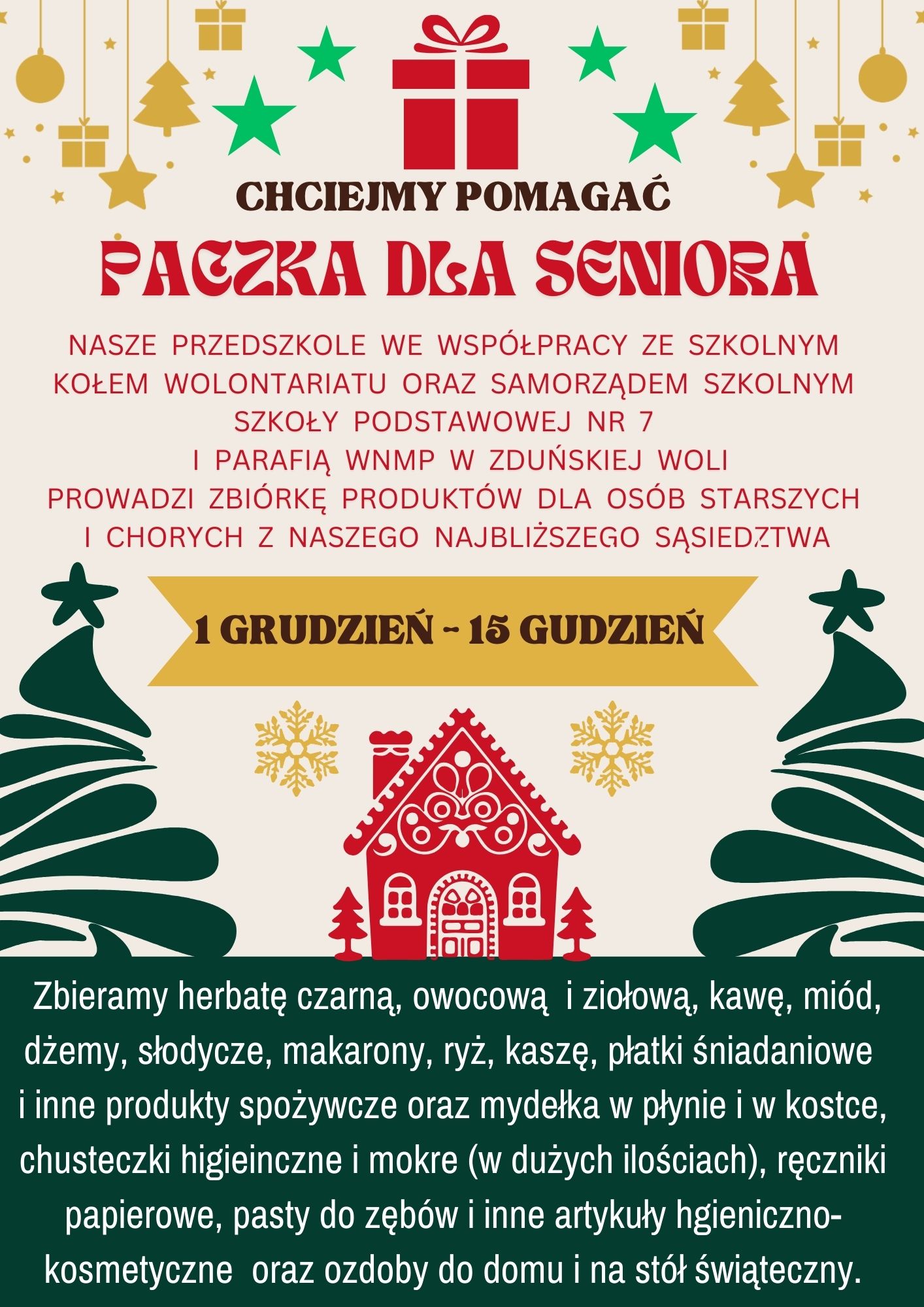 Serdecznie dziękujemy wszystkim Ofiarodawcom, którzy wsparli zbiórkę „Paczka dla Seniora”, zorganizowaną we współpracy ze Szkołą Podstawową nr 7 oraz Parafią WNMP w Zduńskiej Woli. Dzięki Państwa zaangażowaniu, życzliwości i otwartym sercom udało się przygotować paczki, które trafiły do potrzebujących seniorów, niosąc im radość i poczucie, że nie są sami. Koordynatorem akcji w naszej placówce była pani Renata Jaros, której serdecznie dziękujemy za zaangażowanie i sprawną organizację działań. Razem możemy więcej – dziękujemy za okazane wsparcie i piękną lekcję wrażliwości społecznej.